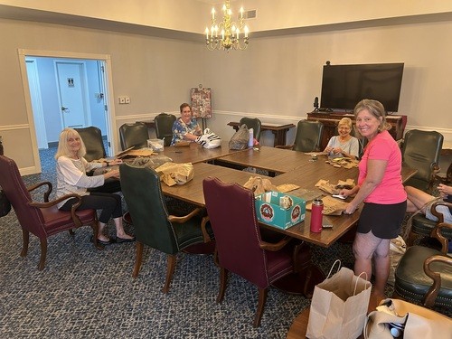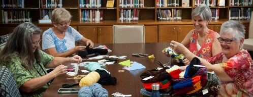 Throughout the year, hats and scarves are knitted or crocheted and then donated to those in who lack warm clothing during the winter months and to chemo patients at local hospitals. Knitting ability is helpful but not necessary. Hats are created on round looms, making it easy for those with limited experience to participate. Training on using the round looms is provided.
